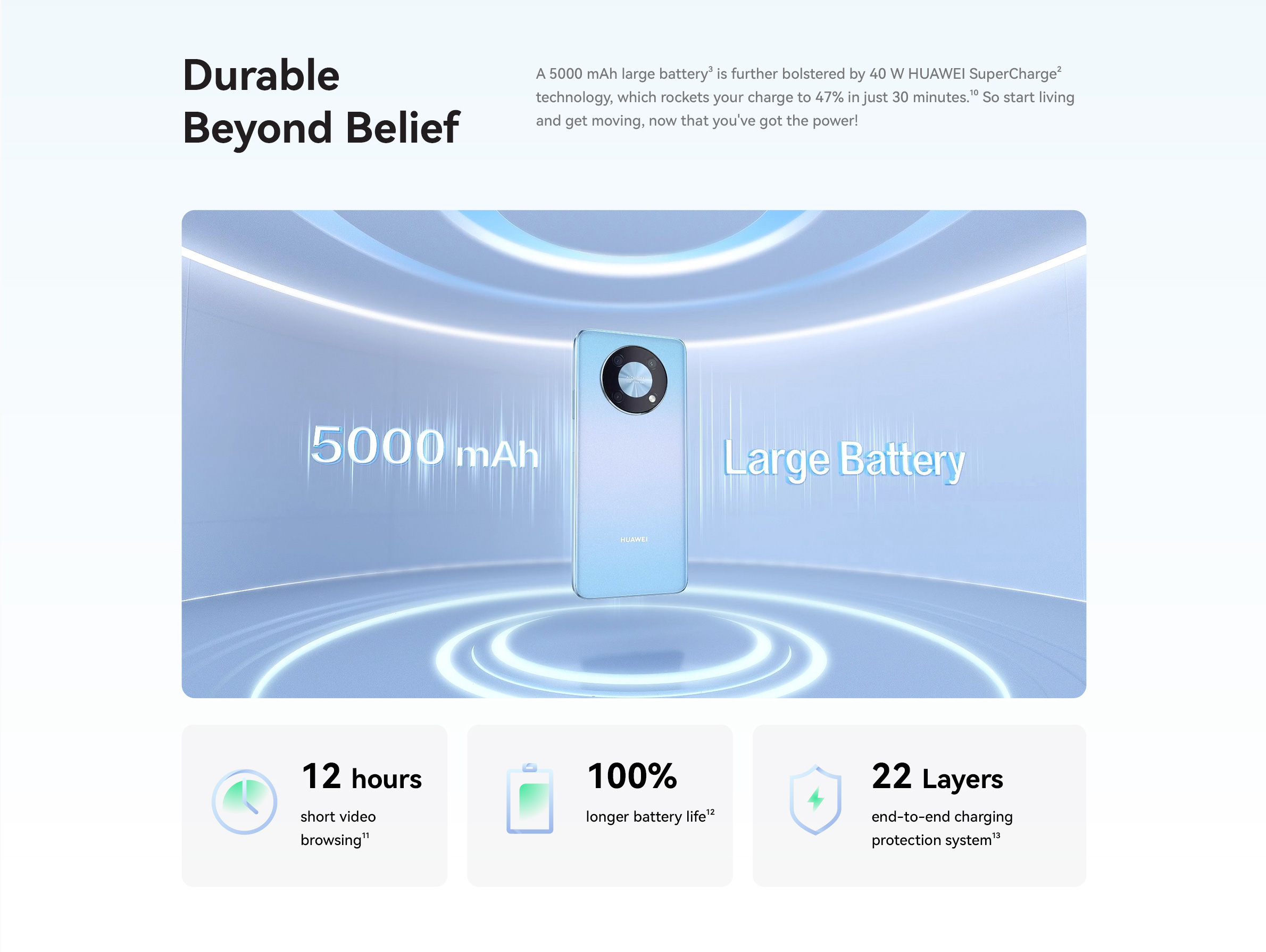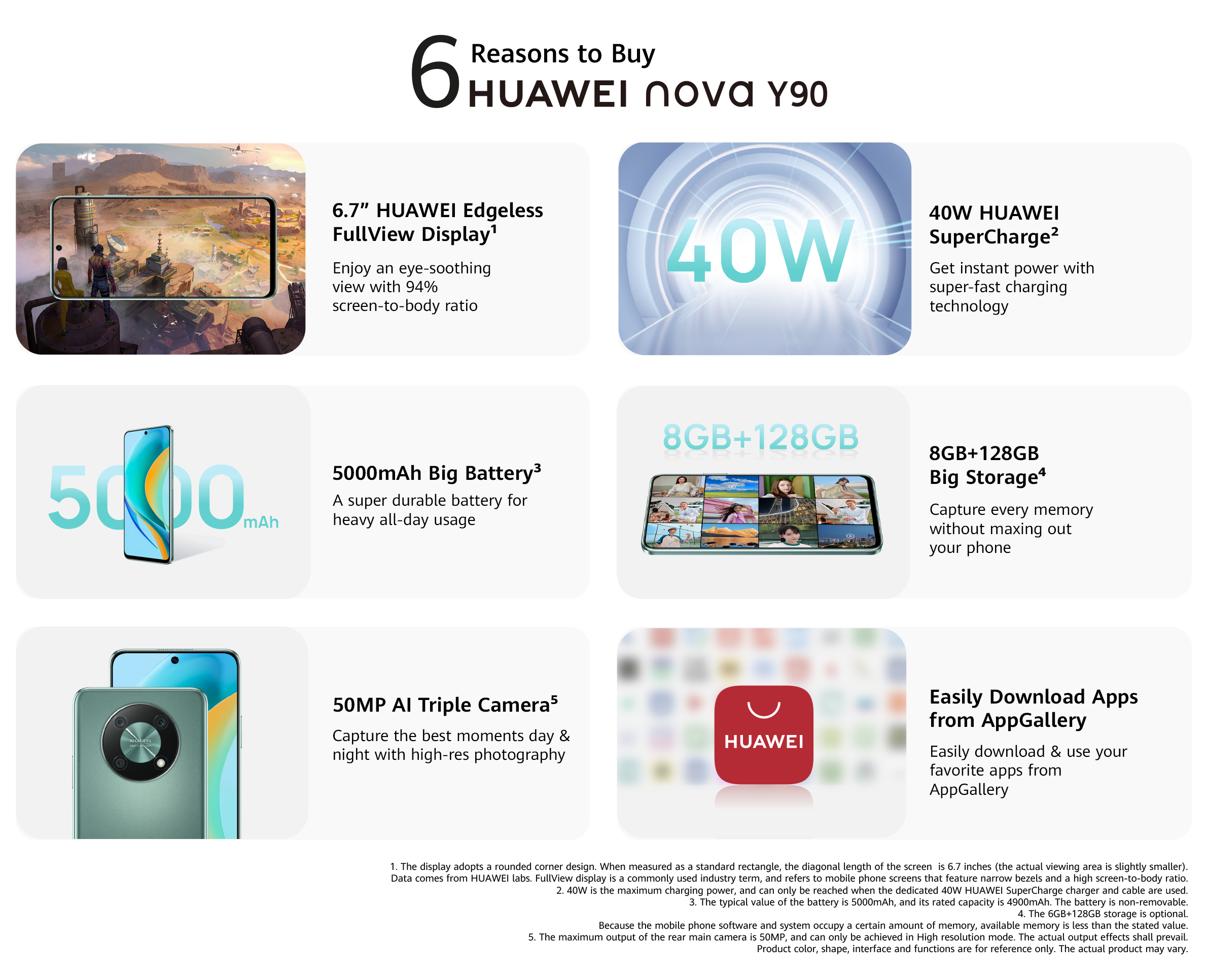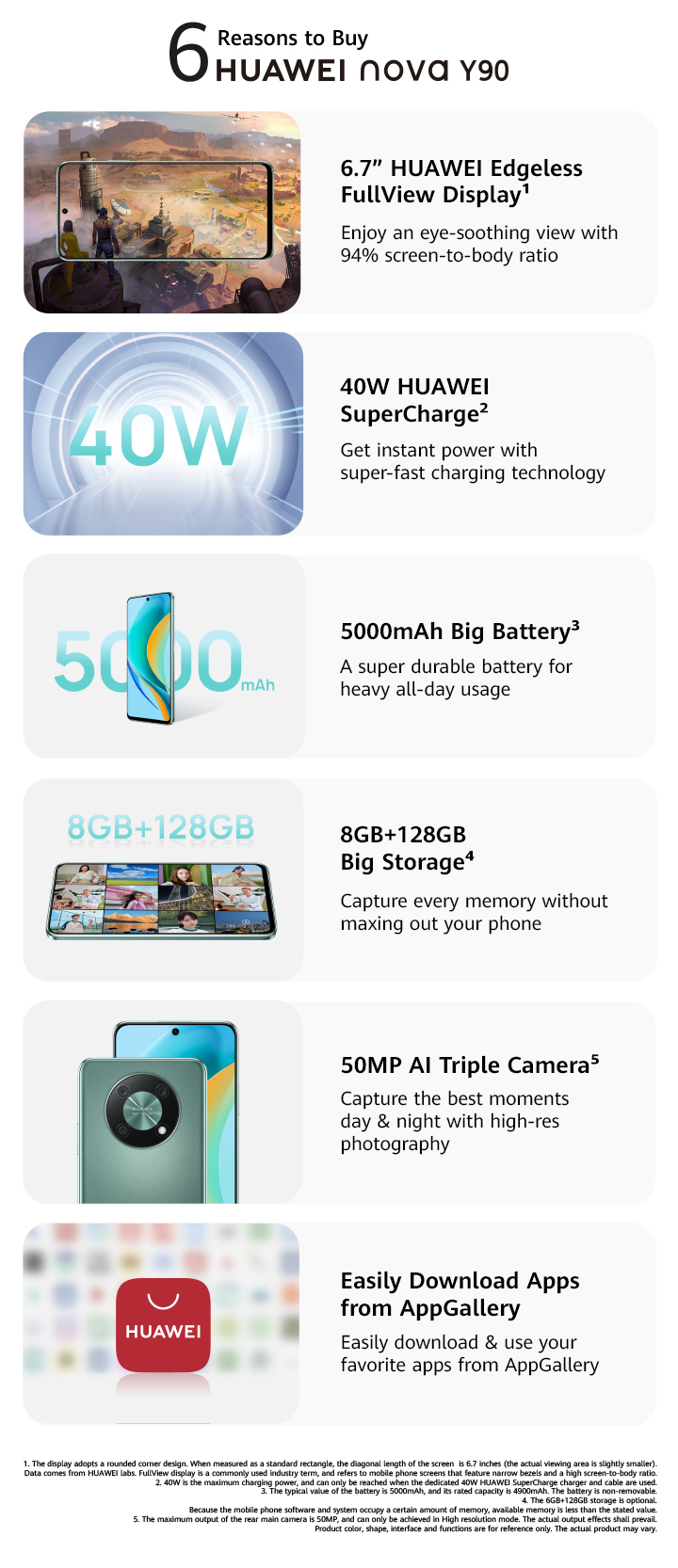 <p>HUAWEI geared nova Y90 with a 5000 mAh large battery and a 40 W HUAWEI SuperCharge technology, which rockets your charge to 50% in just 30 minutes!</p>