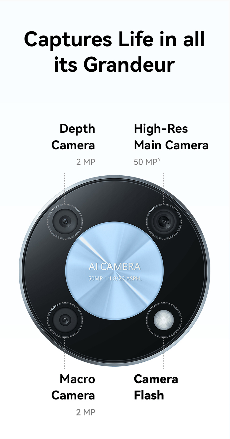 <p>HUAWEI nova Y90 has a space ring camera syste with triple rear cameras 2MP Depth camera, 50MP High-res main camera, and a 2MP Macro camera. It also has an 8MP front camera works with HUAWEI AI algorithms to put your natural beauty in full display.</p>