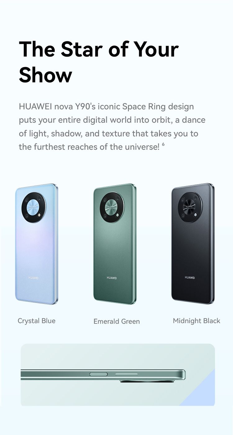 <p>HUAWEI nova Y90 offers a 6.7 edgeless fullview display, boarded by 1.05mm ultra-narrow bezel producing a 94% screen-to-body ratio. And high display features like 2388*1080 </p>