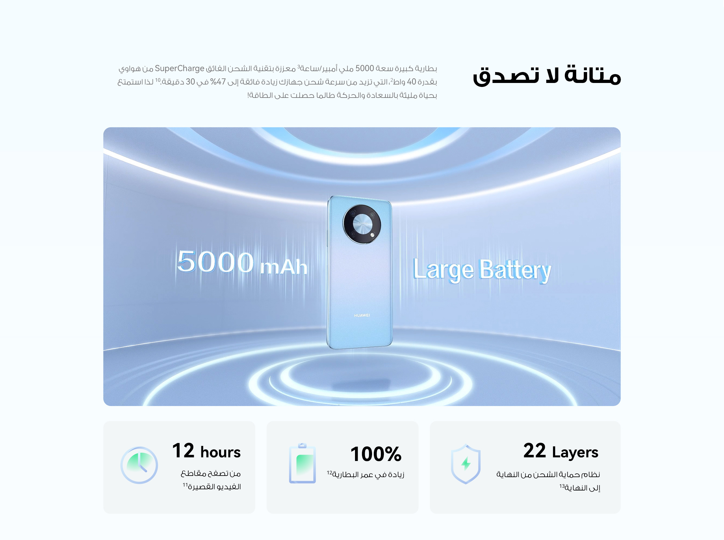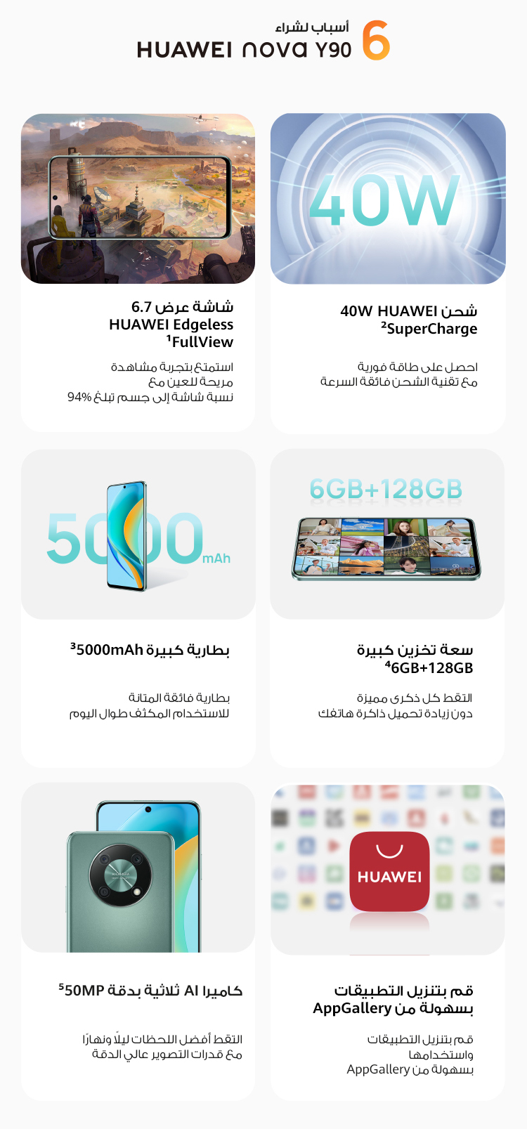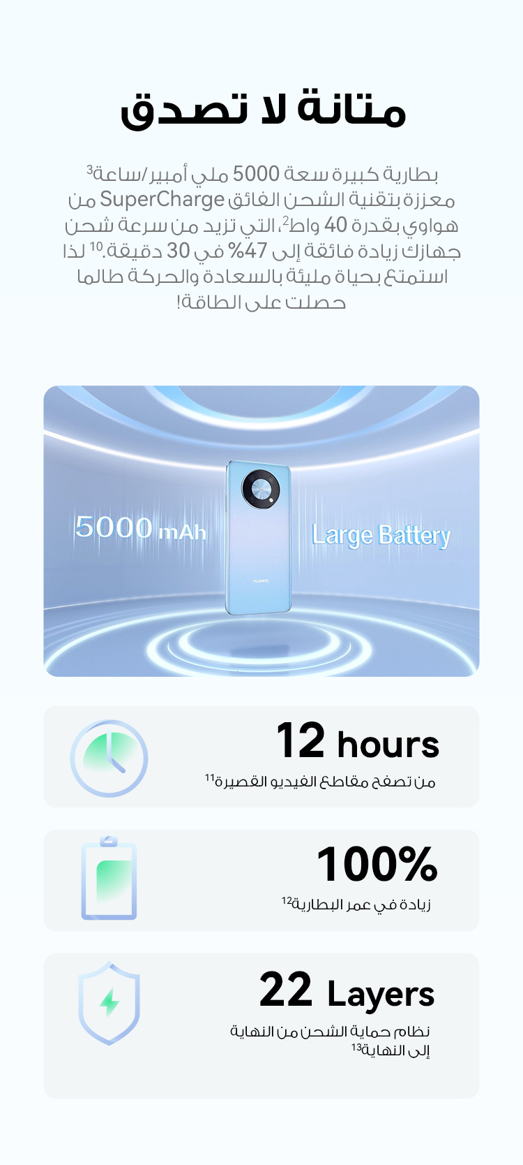 • <p>جهزت شركة HUAWEI جهاز nova Y90 ببطارية كبيرة حجم 5000 mAh وتقنية HUAWEI SuperCharge بقدرة 40 واط، والتي تزيد من شحنتك بنسبة 50٪ في 30 دقيقة فقط!</p>