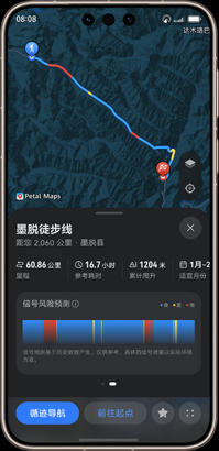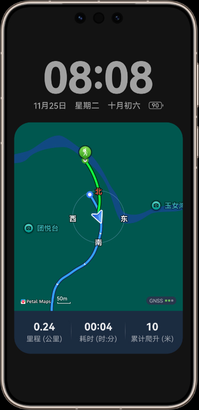- 数据来源于华为实验室,实际使用中可能因产品个体差异、使用习惯和环境因素不同而有所不同,请以实际使用情况为准。低功耗熄屏循迹导航,可熄屏查看地图及目标路线,最长可连续熄屏循迹导航 36 小时;该场景测试模型:进入户外探索—极限续航,出厂默认设置,手动开启飞行模式,开启花瓣地图循迹导航,熄屏进入 AOD 导航。