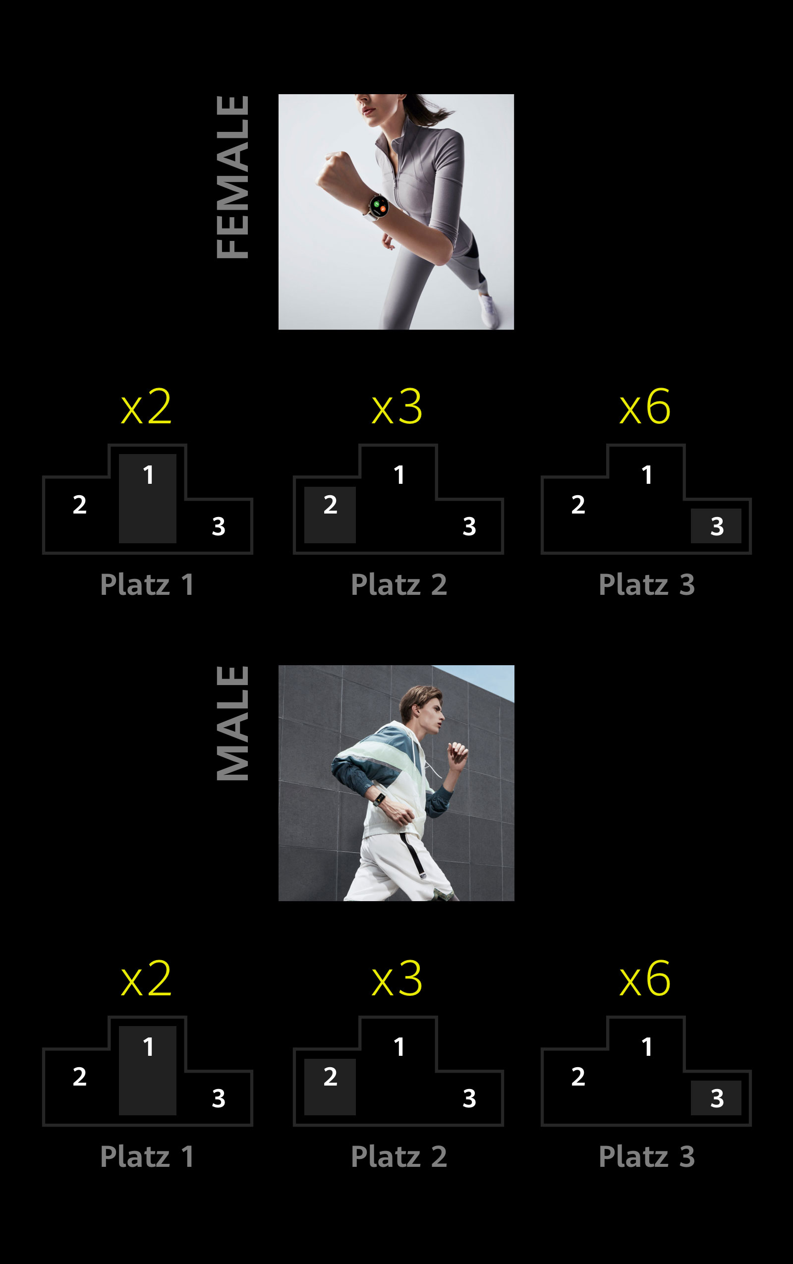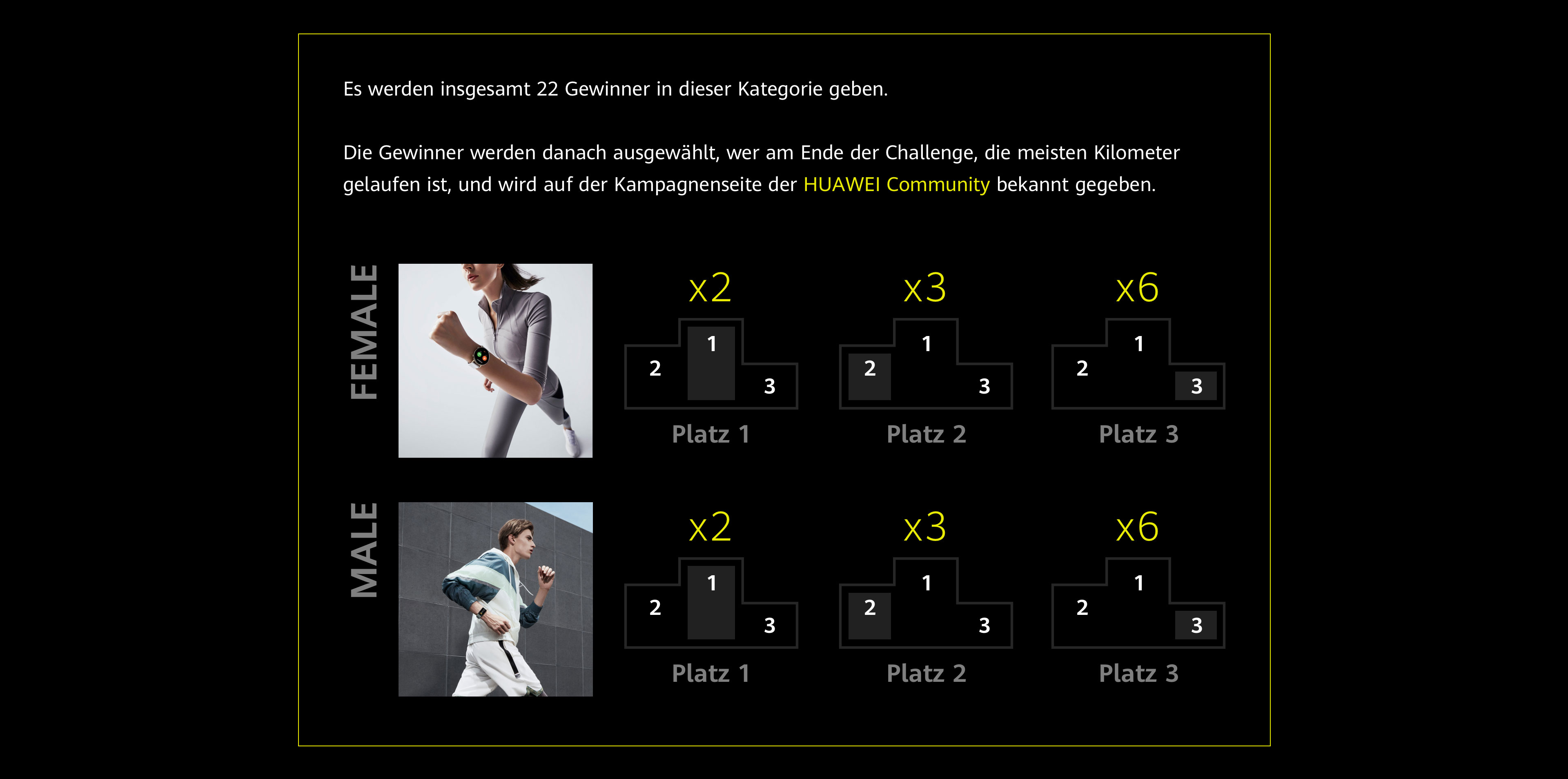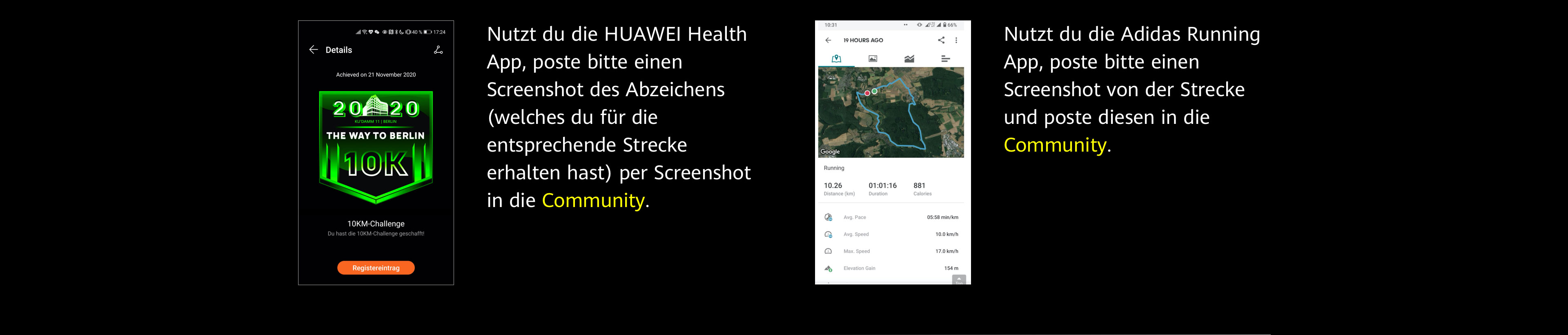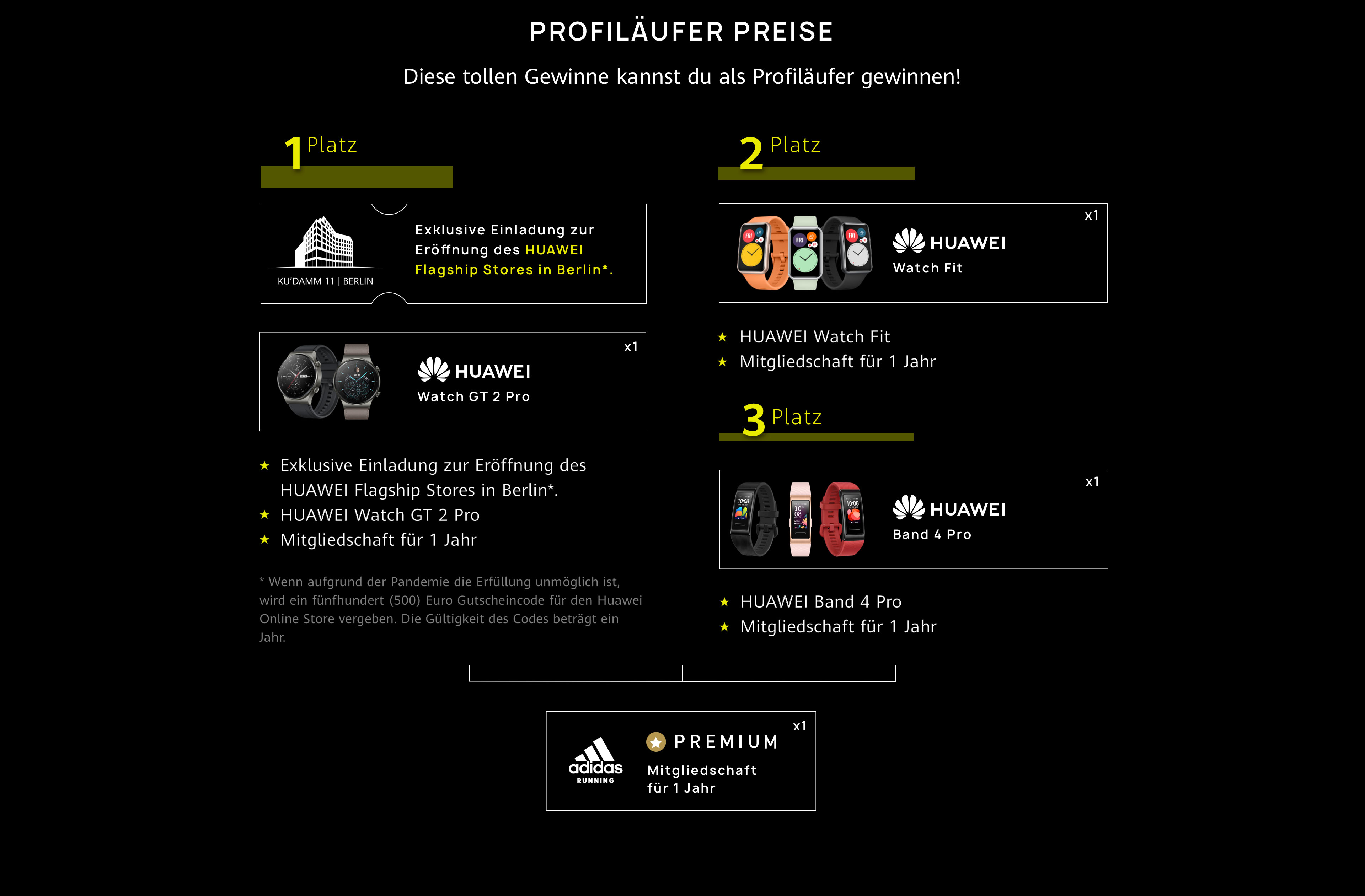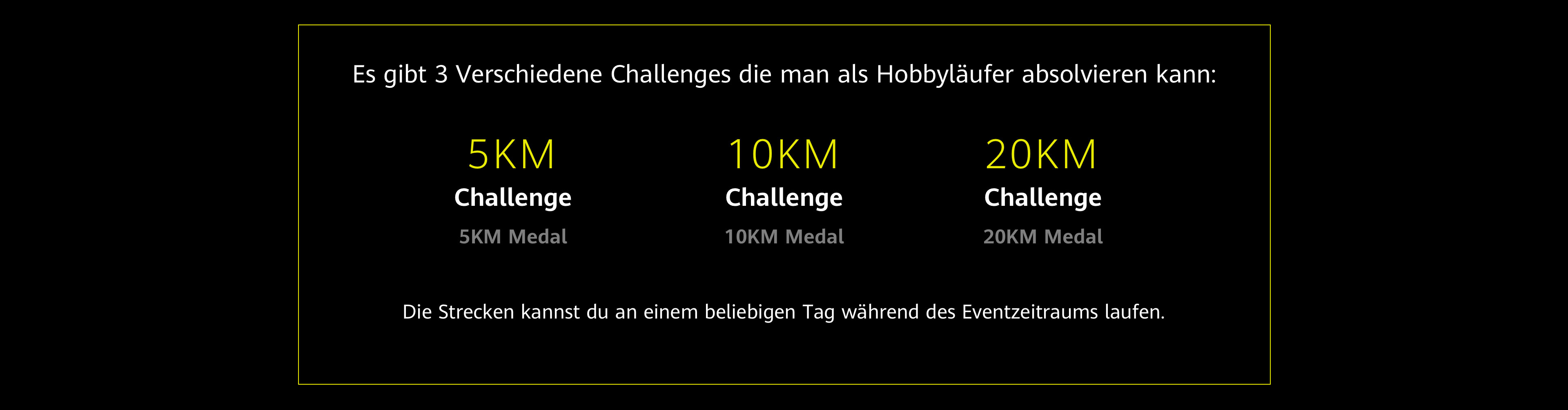 +Wegen unterschiedlichen Backstage Systemen gibt es minimale Unterschiede in der Kategorie der Hobbyläufer. Bei Teilnahme an der Challenge über die HUAWEI Health App muss die Challenge innerhalb eines Kalendertages bewältigt werden, wohingegen bei der Adidas Running App die Challenge am Stück geschafft werden muss.