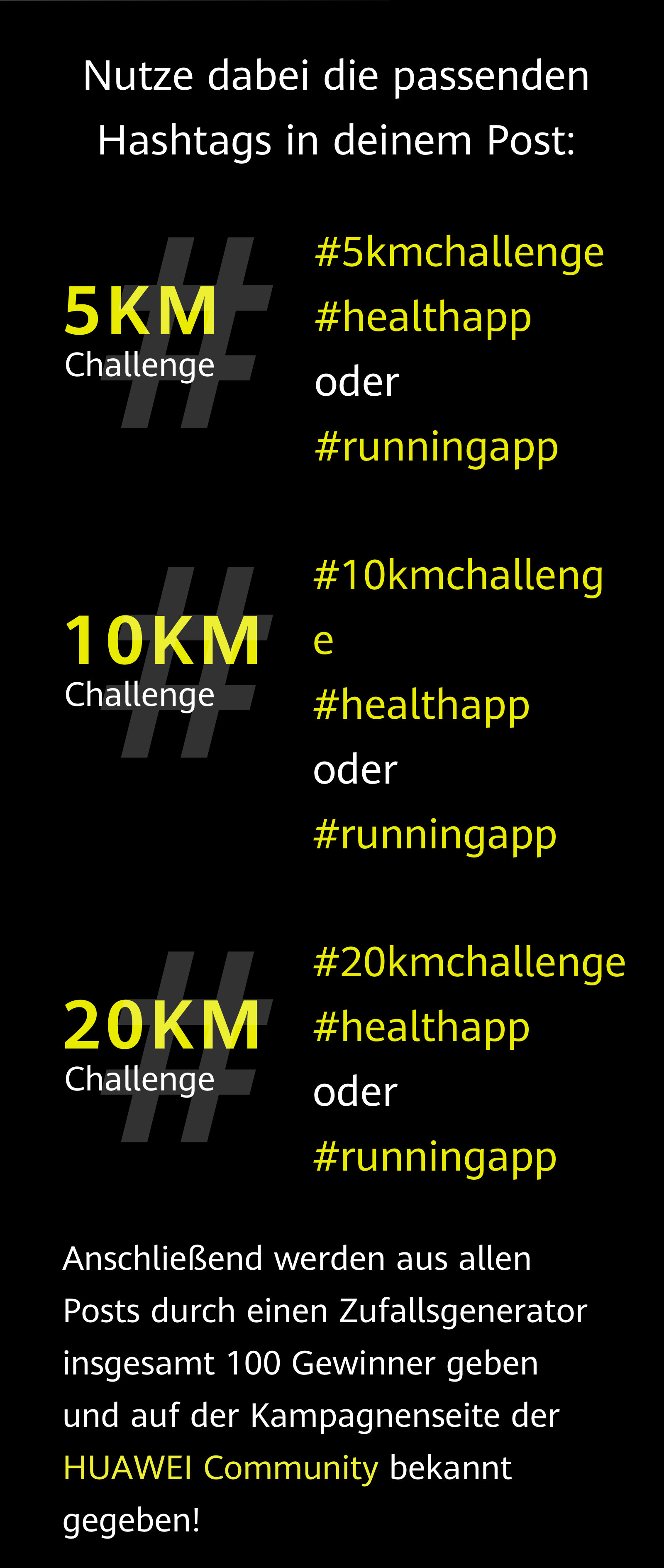 Anschließend werden aus allen Posts durch einen Zufallsgenerator insgesamt 100 Gewinner geben und auf der Kampagnenseite der HUAWEI Community bekannt gegeben!