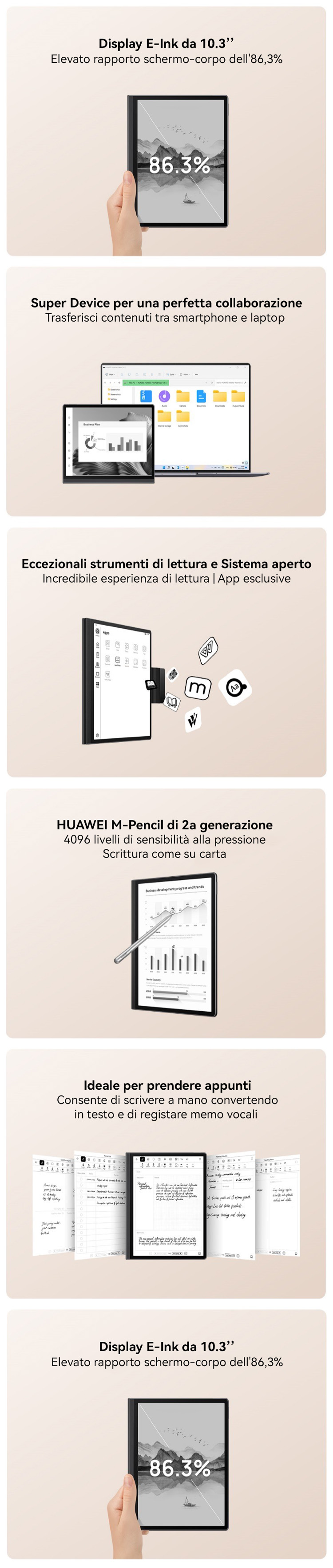 <p>Il display E Link FullView da 10,3 pollici; il supporto a HUAWEI M-Pencil di 2<sup>a</sup> generazione; una ricca disponibilità di pratiche funzioni per prendere appunti; la semplice interconnessione tra più dispositivi; l'intuitiva interfaccia utente di HarmonyOs basata su widget; una grande quantità di strumenti per la lettura; eccezionali prestazioni hardware</p>