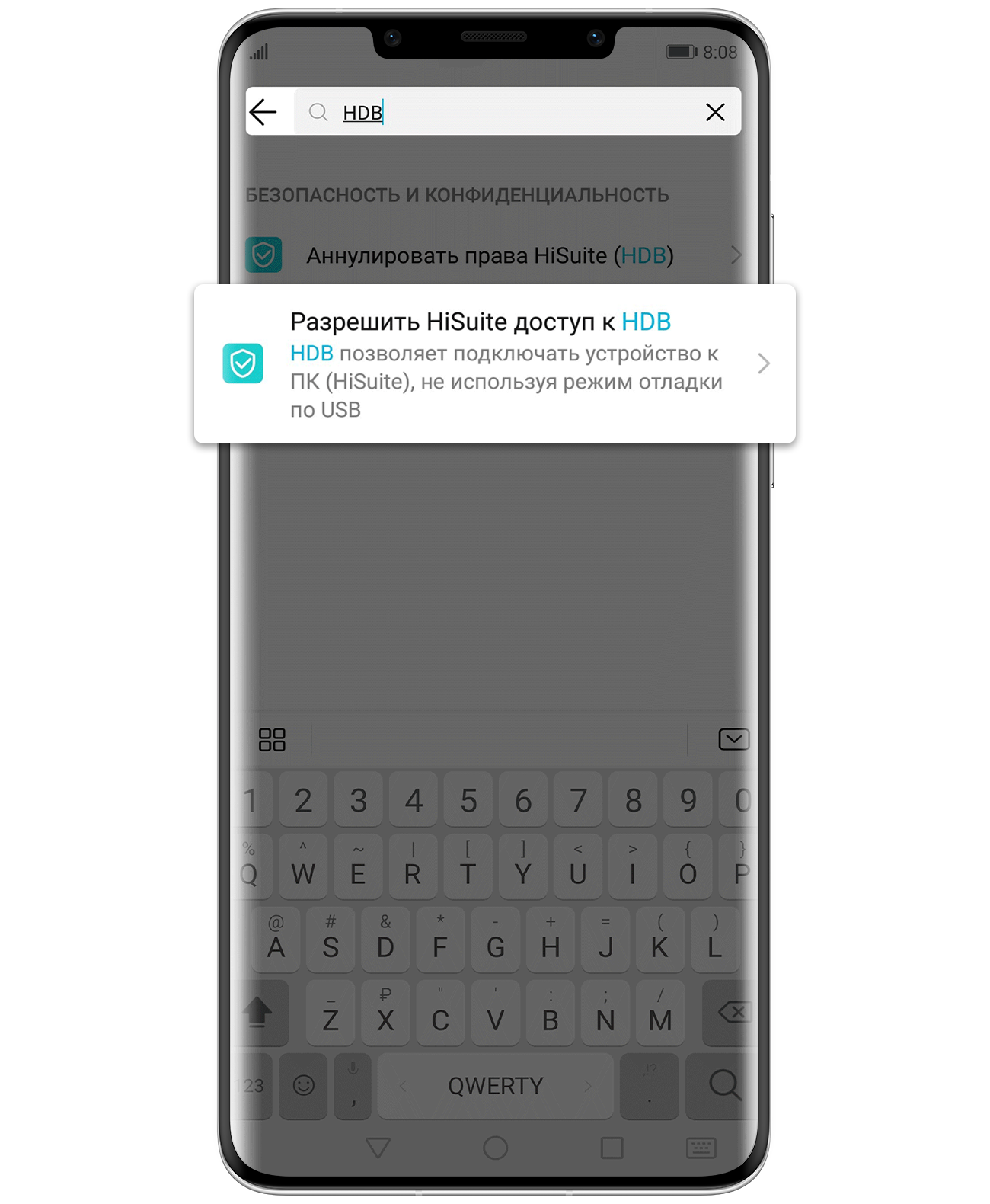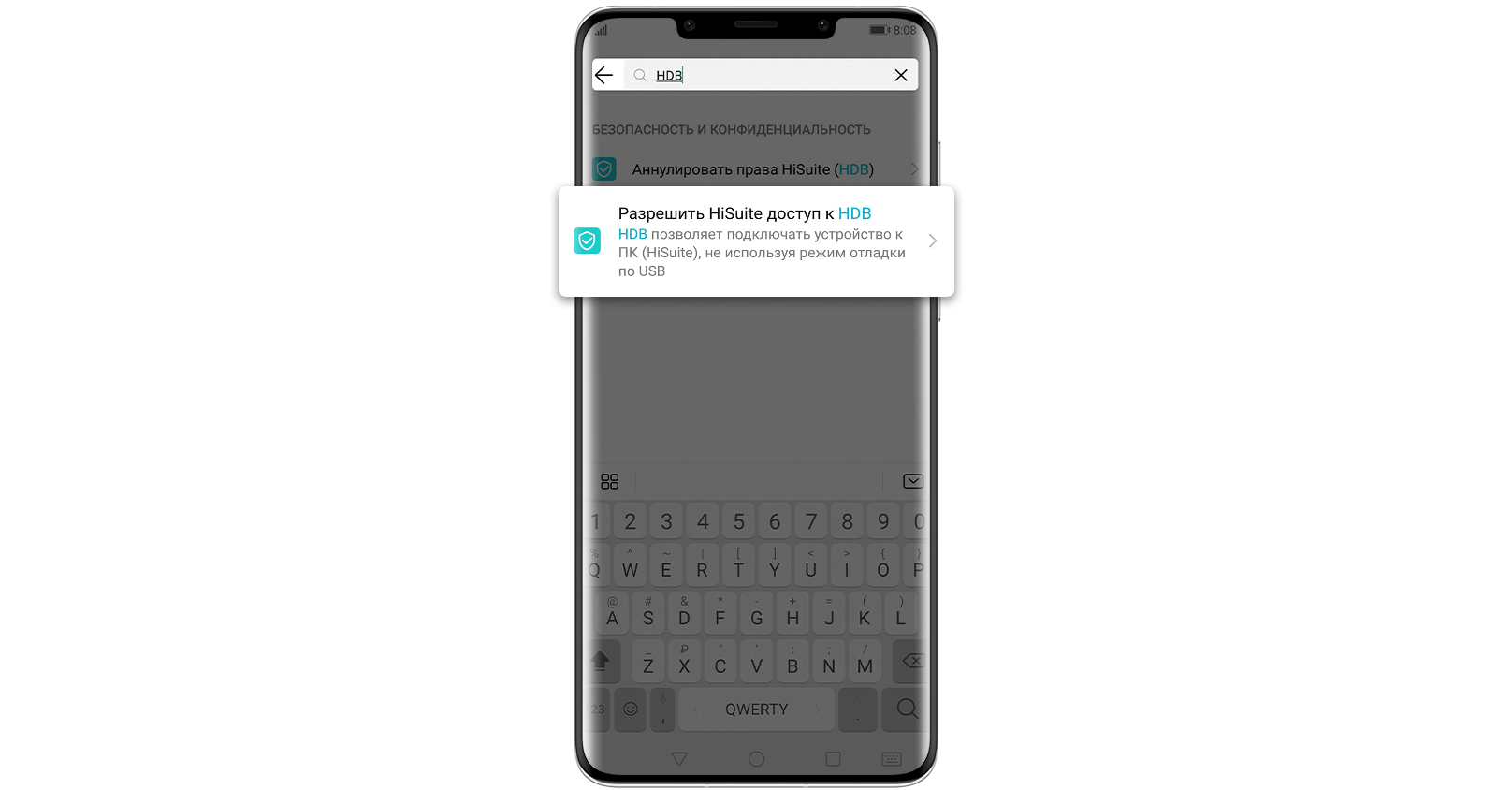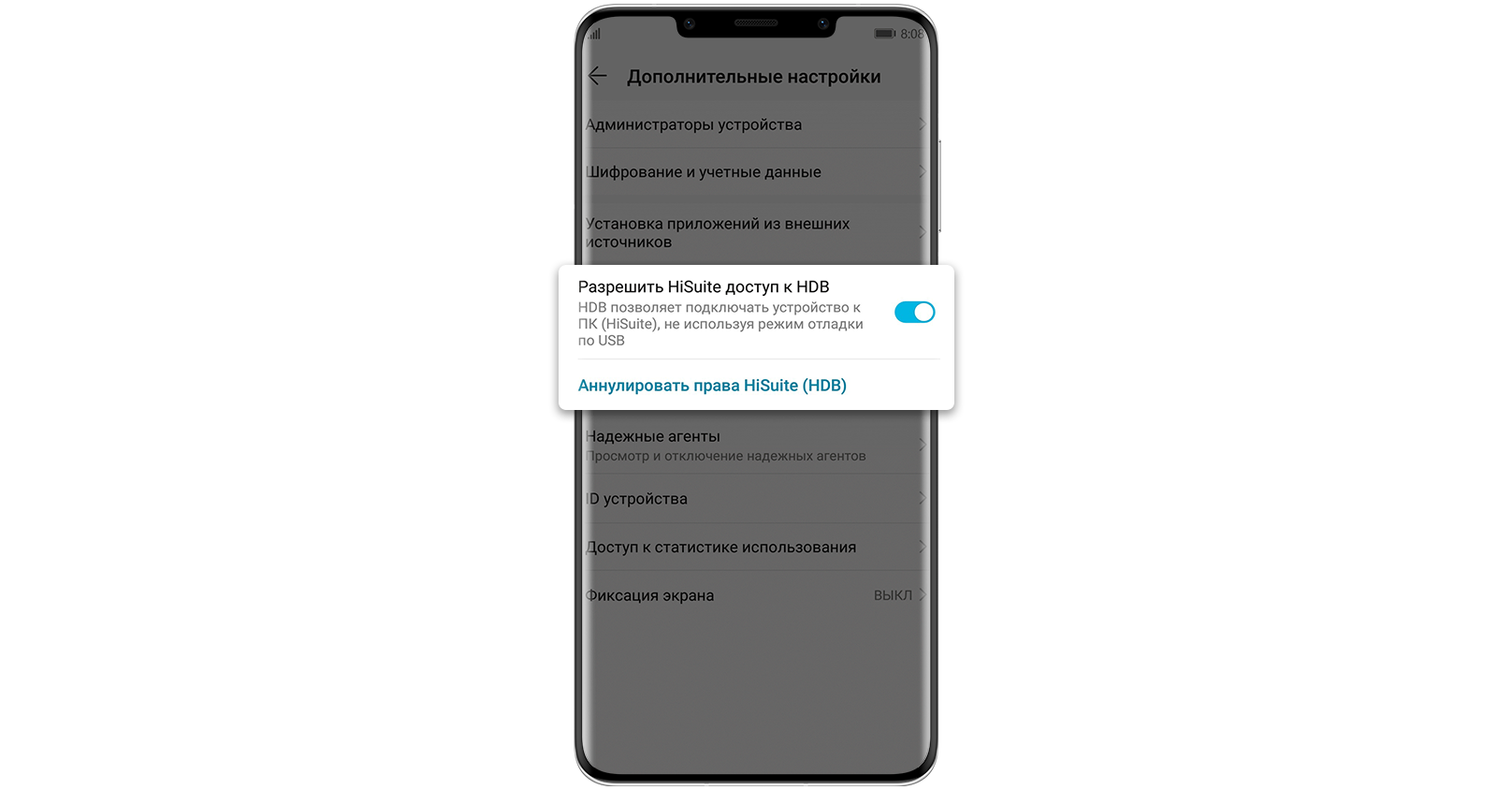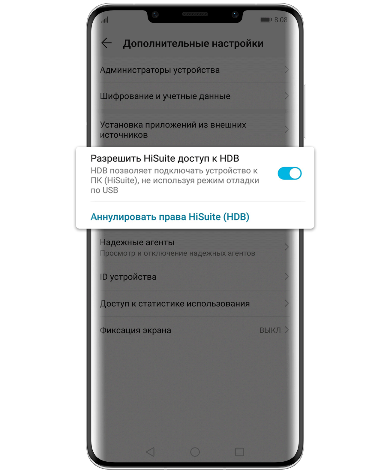 (Выберите "Передача файлов" или "Передача фото" и включите "Разрешить HiSuite доступ к HDB")