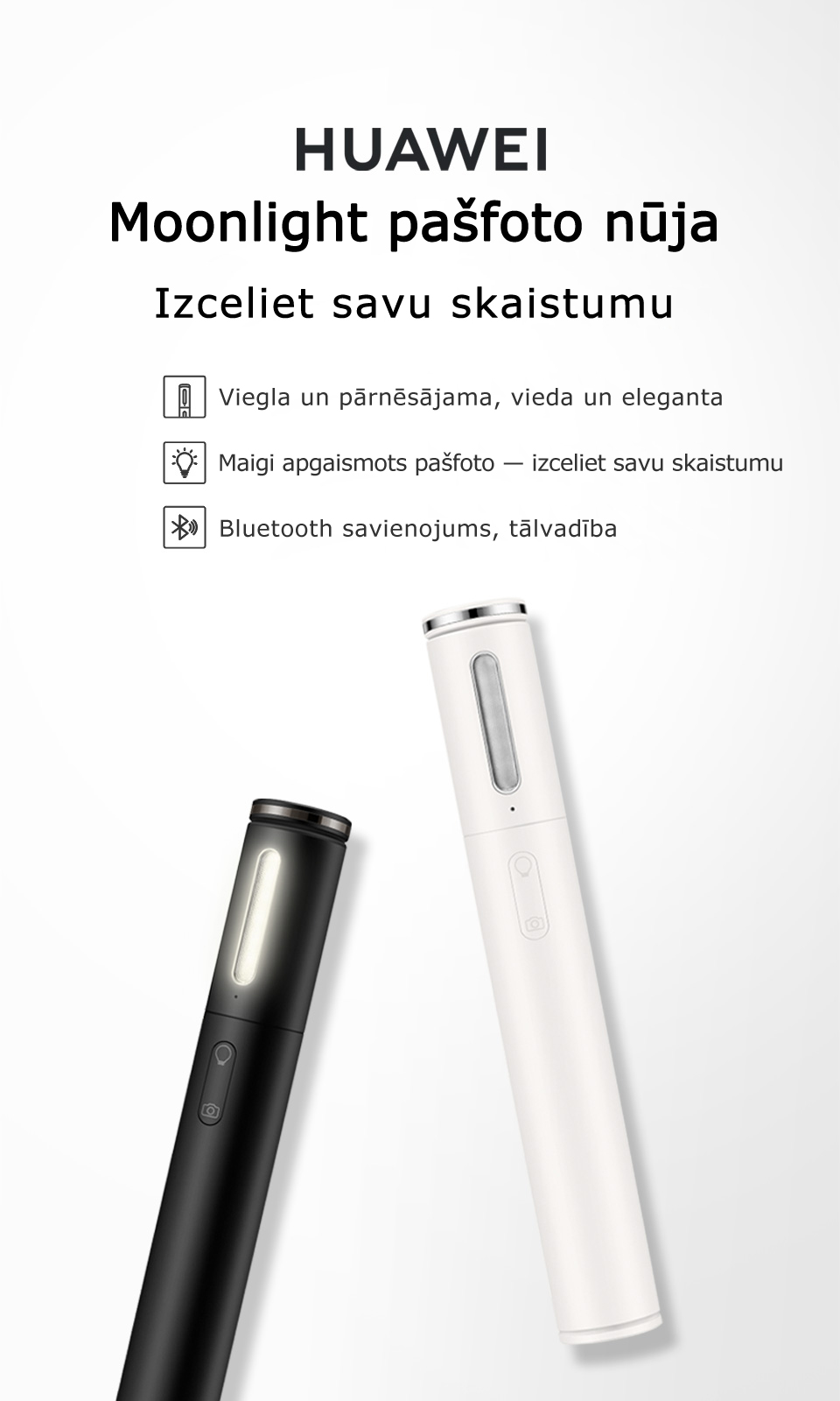 Daudzfunkcionāla konstrukcija: pašfoto nūja, zibspuldze un nakts lampiņa — trīs vienā.