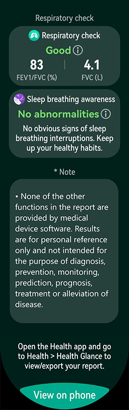 - Funkcija "Health Glance" nije softver medicinskog uređaja. Rezultati su samo za ličnu referencu i ne bi trebalo da se koriste kao osnova za medicinsko istraživanje, dijagnozu ili lečenje.