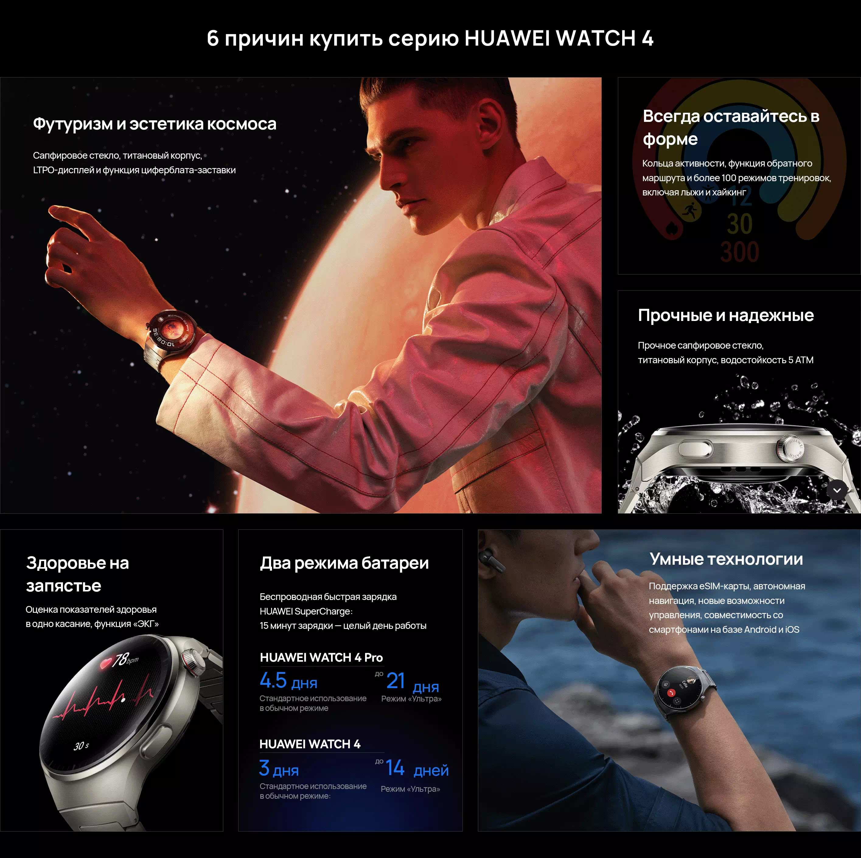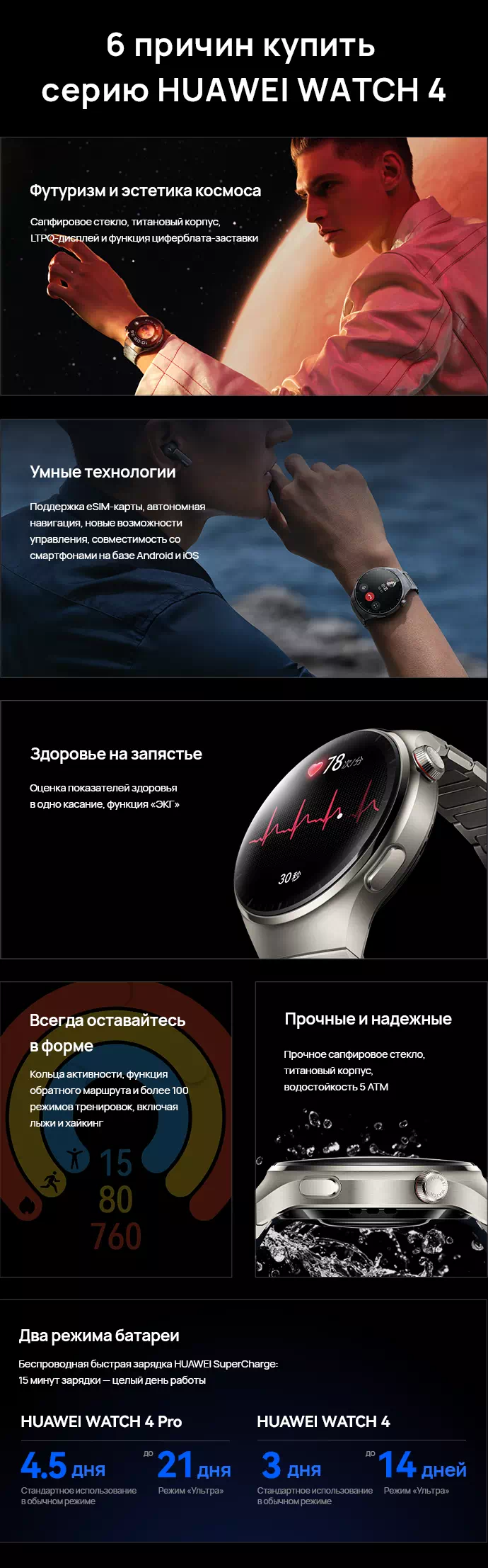 <p>Серия часов WATCH 4 поддерживает 100 режимов тренировок, включая высокотехнологичные, такие как гольф, фридайвинг и горные походы, а также кольца активности.</p>